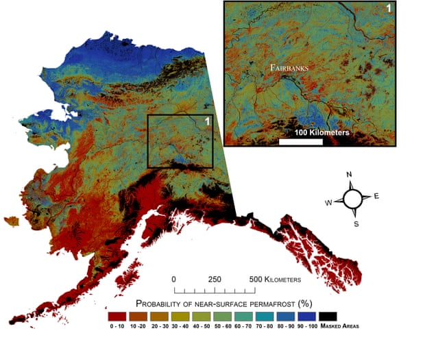 The US Geological Survey used satellite and on-ground data to estimate that 38% of mainland Alaska has permafrost, a band of soil, rock or sediment that is frozen underground for at least two consecutive years. In Fairbanks, Alaska, the soil has been frozen for several thousand years at just 30 to 40cm underground, with only the upper level of soil thawing every summer before freezing again in winter.